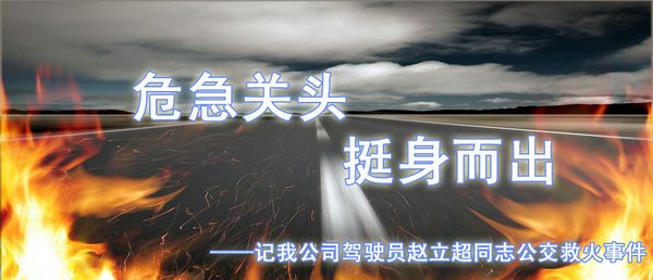 10年9月9日下午3:00左右,我公司驾驶员赵立超同志驾车与哈网络部同志去市内办事,途中经过公滨路与红旗大街交叉口处,突然发现一辆停在路边的103路公交车,车内不断向外涌出浓烟,发动机位置滚滚浓烟卷着火舌向上窜,车内已空无一人,火势越来越大。司机赵立超同志说怎么没人救火,同时把车快速停在路边,凭借着他对公交车辆内部构造极其熟悉的特点,三步并作两步跑上燃烧的公交车,以一连串迅捷的动作拿起车上的灭火器,拔下安全栓,对准燃烧的发动机进行喷射。当时公交车内已经全部是浓烟,看不清车内情况,情况非常紧急,围观的群众手里捏着一把汗,为车上勇敢的小伙子担心,车内的浓烟不断从车窗内呼啸着涌出。此时的时间就像静止了一样,大家都屏住呼吸观察着车内情况,大概两分钟后,车内大火终于被熄灭了。这时车内跑下来一个身上挂满白色泡沫液的人,他正是我公司驾驶员赵立超,看到他安全地从车内下来,围观的群众鼓起热烈的掌声,为勇敢的小伙子送去敬佩的眼光。他随手拍打着身上的泡沫,开车消失在茫茫的车流中……